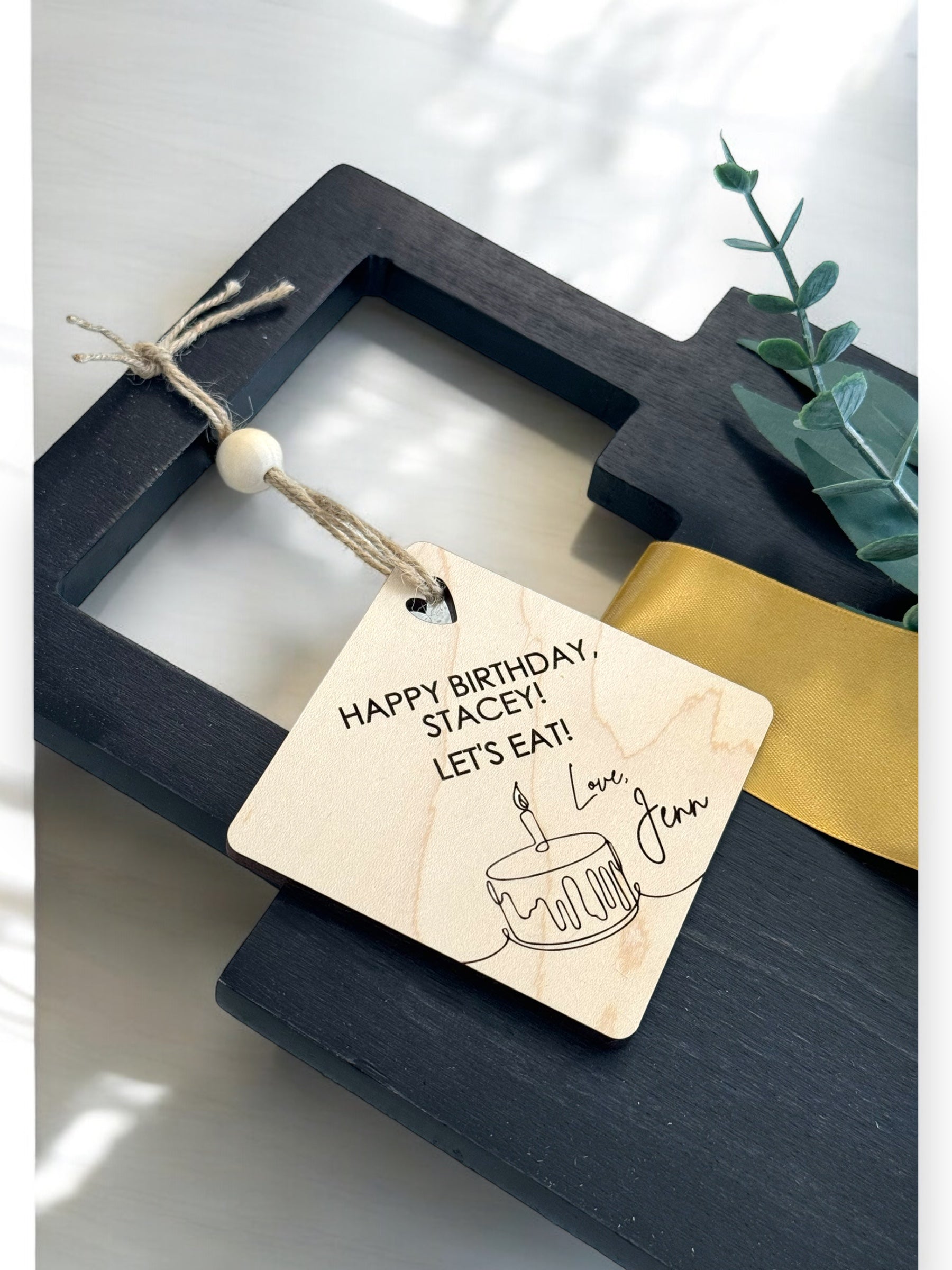 Complete this set with your own custom wood tag, perfect for gifting! When it comes to the gift tag, the sky's the limit. For a closing gift, we can have a house shape; for a birthday, we can include special birthday icons (see photos), for a just because gift, we can have a heart shape. If you think it, we can do it!