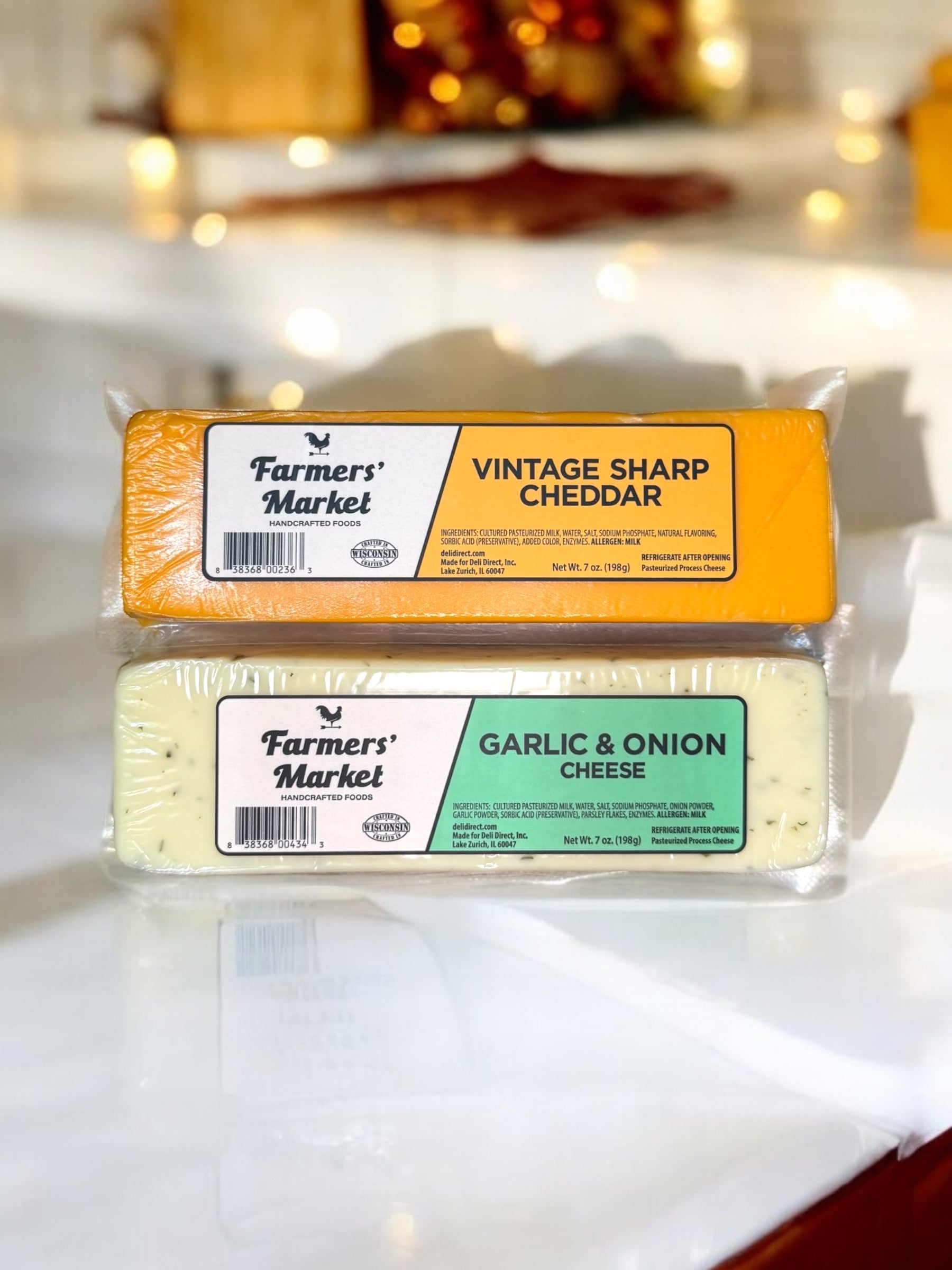 -1 block each shelf stable cheese (7oz each Vintage Sharp Cheddar and Garlic & Onion)