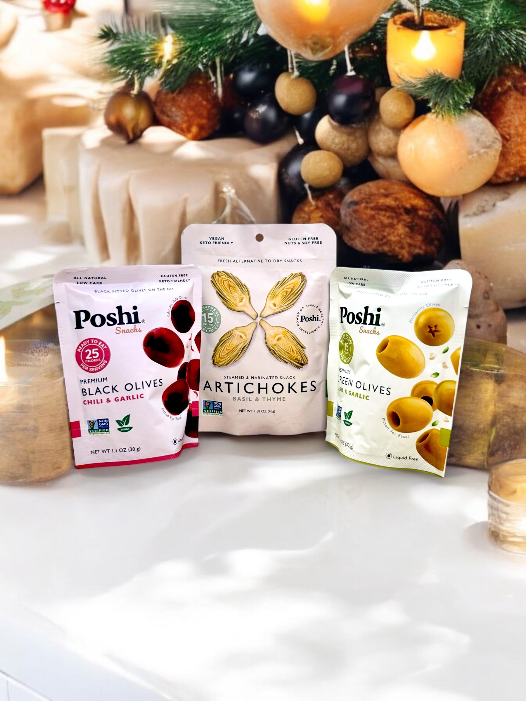 -1 pouch chili & garlic black olives, 1 pouch basil & garlic green olives, 1 pouch basil & thyme artichokes