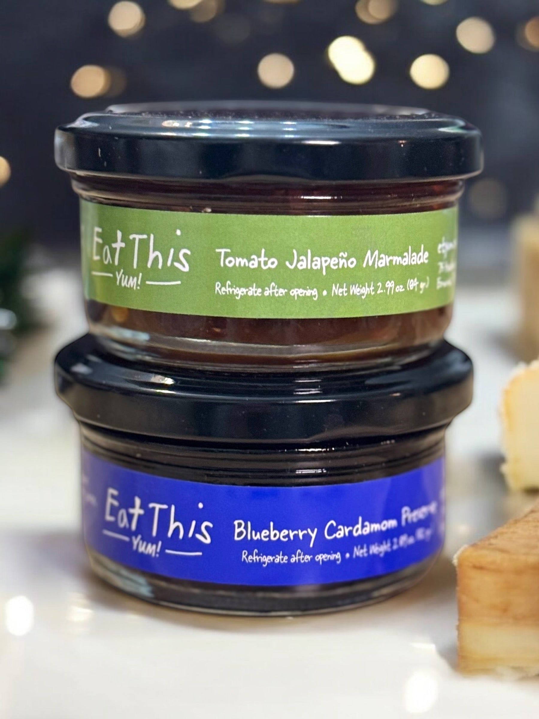-1 jar (2.99oz) tomato jalapeño marmalade, 1 jar (2.99oz) blueberry cardamom preserves