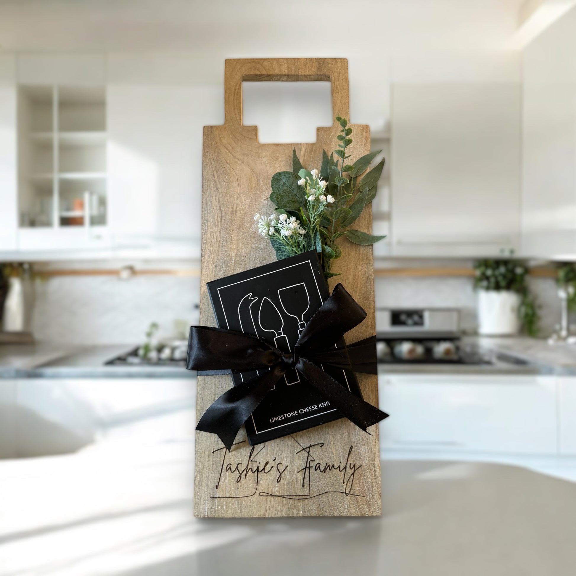 Ready for a WOW gift?! This white ash charcuterie board & cheese knife set is SURE to impress the best. The board is made of mango wood and measures approximately 9"W x 24"L x .65" H. This board can be engraved with any message, quote, or image of your choosing.