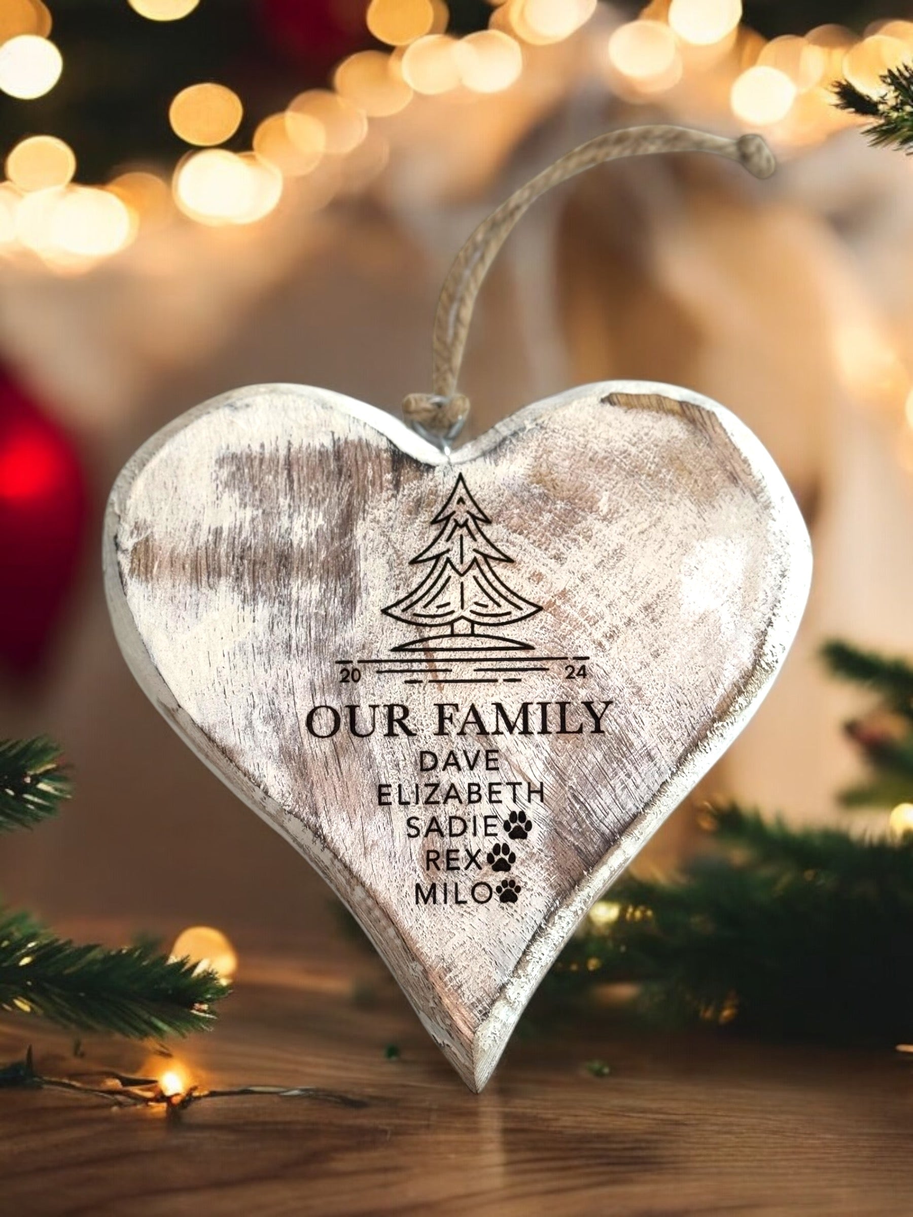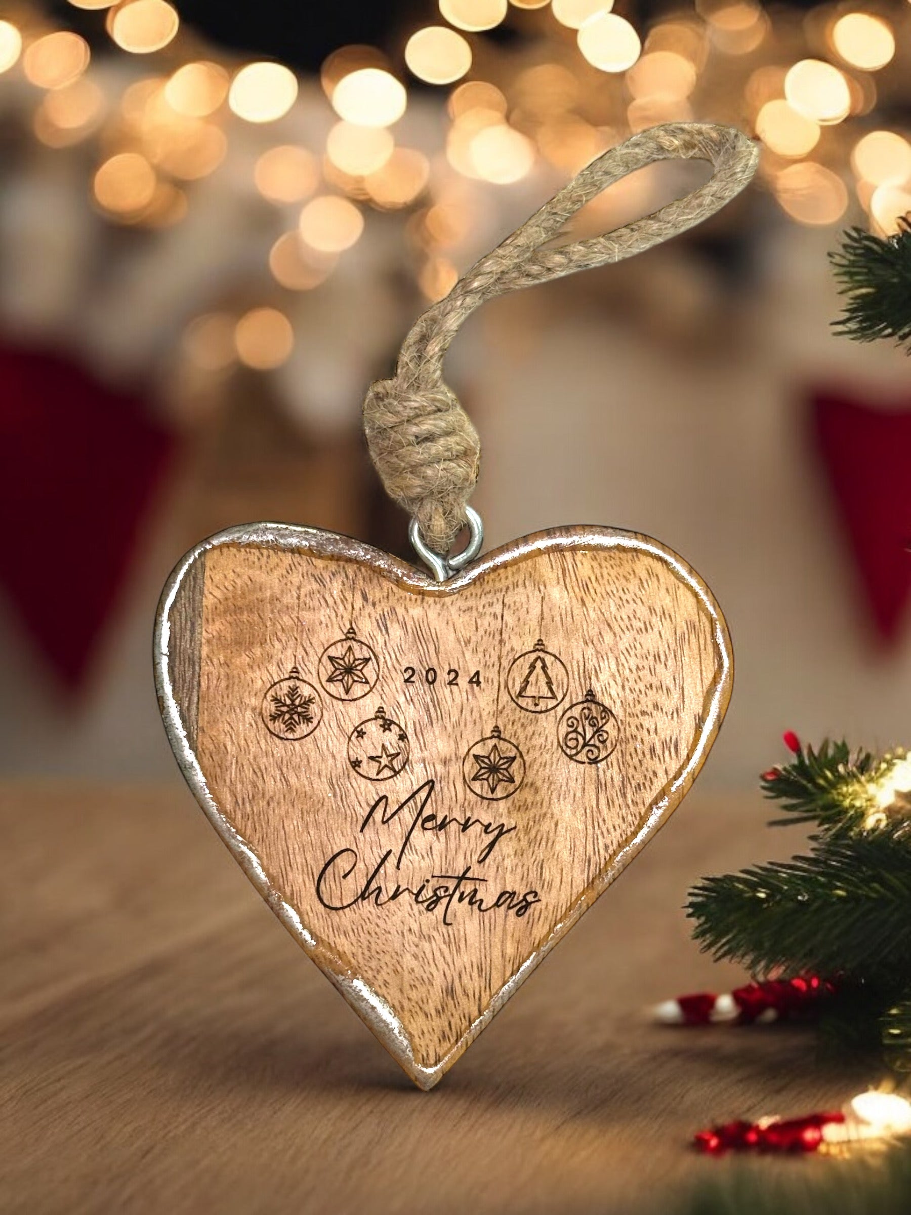 -The wood heart ornament design allows you to interchange "Merry Christmas" for a family name or first names. For example, instead of "Merry Christmas", you could personalize with "The Johnsons" or "The Johnson Family" or "Jane & John".
